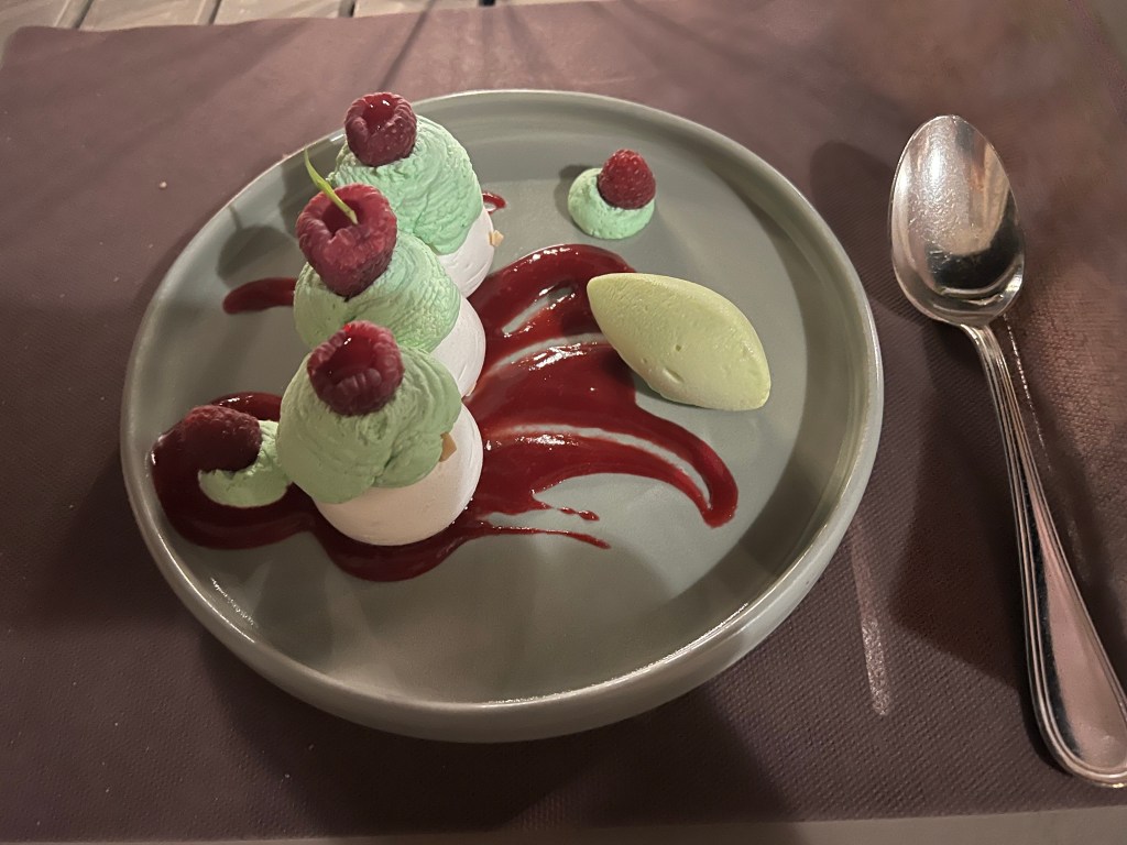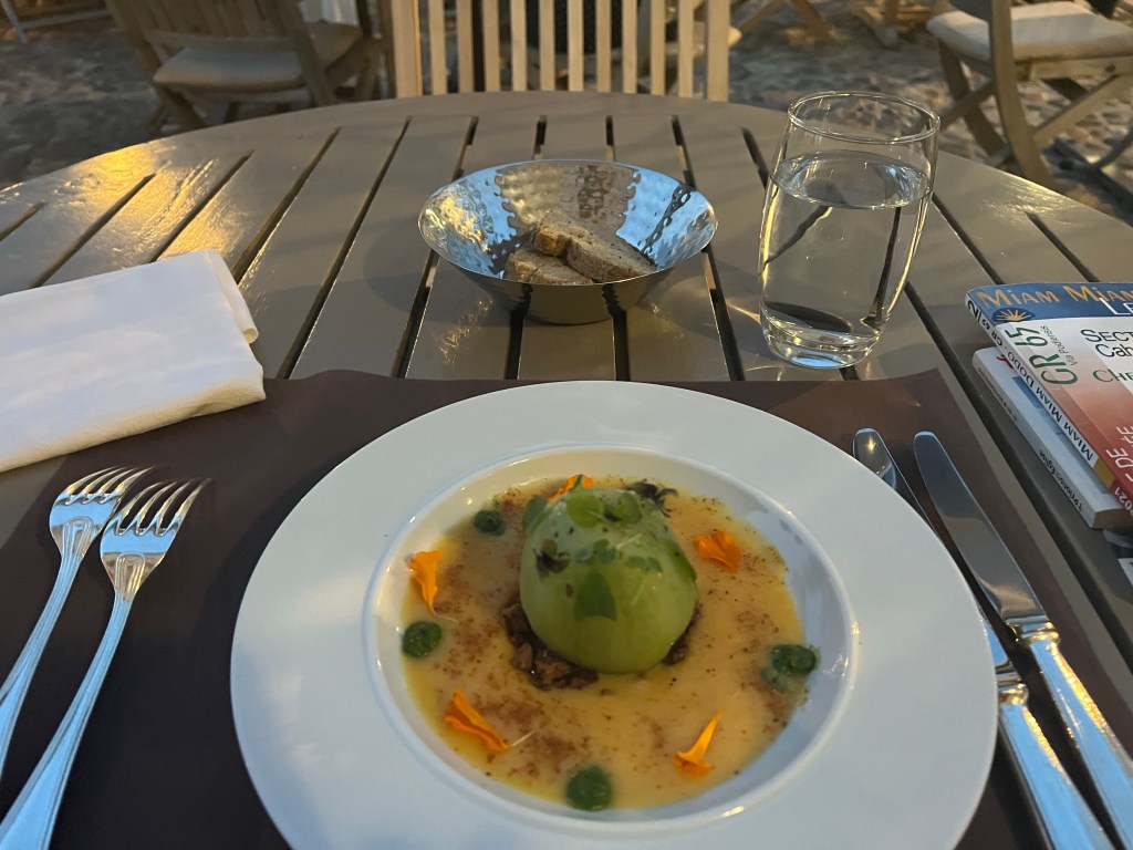 First course of my meal: an heirloom green tomato with pesto and some amazing sauce