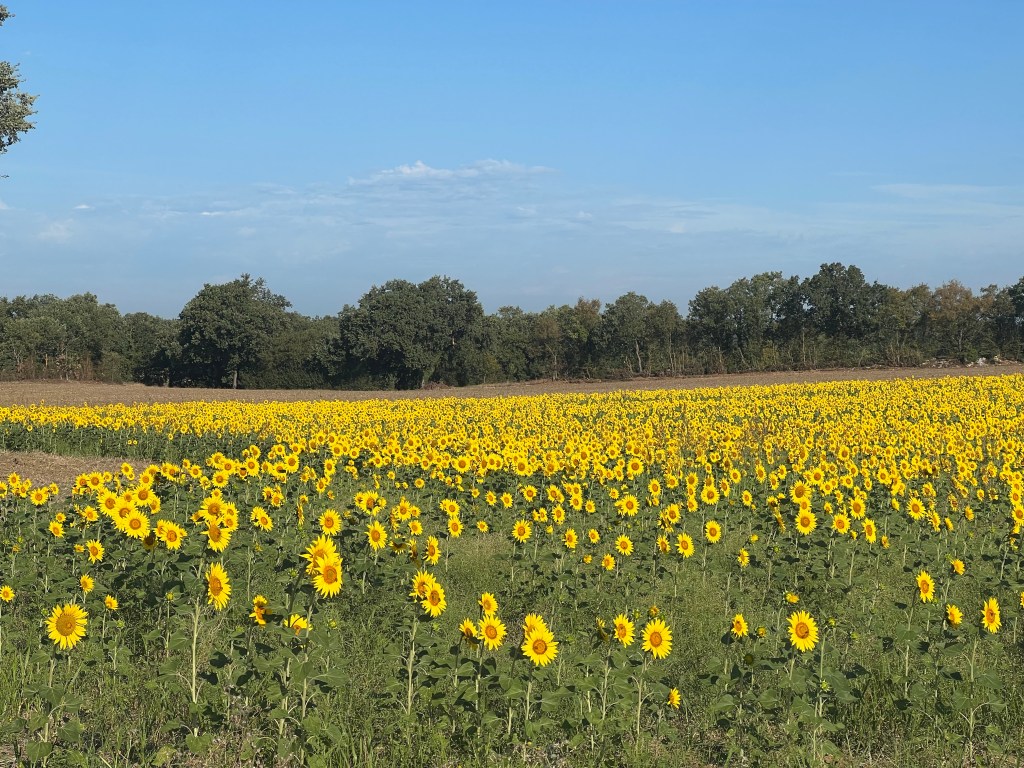Today I walked a little over 13 miles to La Romieu, where pilgrims have journeyed for centuries. Beautiful fields of bright yellow sunflowers today and a few forests to pass through. Lots of hunting preserves posted. I tried to make fewer stops and I wasted no time off the path. Had a few nice talks with fellow pilgrims. A 26-year-old man from Montpellier and two older gentlemen from La Rochelle. One of them had walked all the way ftom Le Puy en Velay to Santiago twice. Now he is ill and walking very slowly. His friend explained all this to me as we walked ahead for a while. (My pace seemed to impress him and a few others; I explained I need to walk fast when I can: mornings and on the flat.) He said their wives would meet them at Romieu later with the car. That’s all they can do these days: short stretches. He wished me well and went back to walk with his friend.