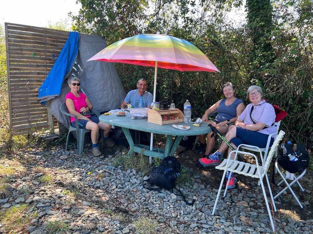 And the day before yesterday, when we discovered a place to buy some food to eat later as a picnic lunch sur le Chemin, a salad was listed in the menu. I ordered one but the lady said, “Ah, non! That must be eaten here.” What? No plastic containers like I get too often at Hy- Vee? The homemade ham & cheese quiche was wrapped in some sort of paper and I put that in my back pack. And now I recall that I couldn’t buy a juice in a glass container either. So I decided to just drink water from my refillable bottle.