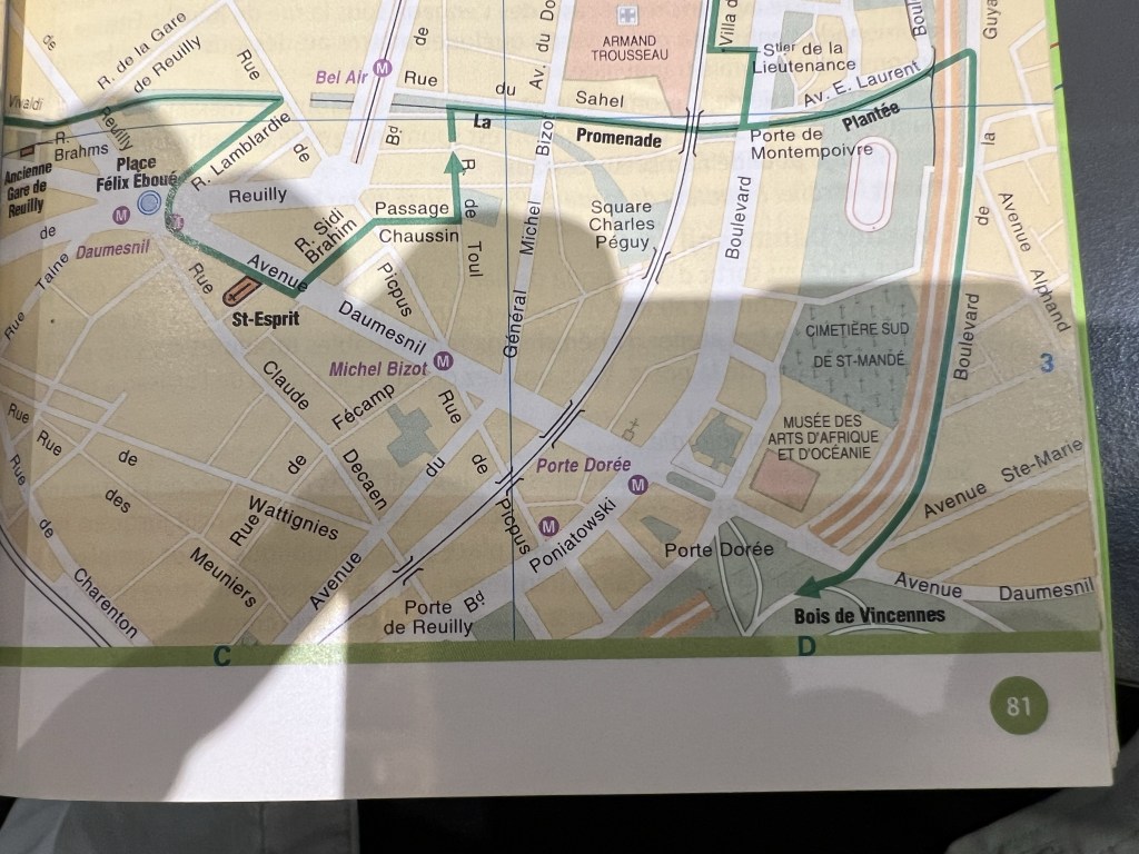 Okay, I like to walk. But I also wanted to avoid the metro and busses because bedbugs have been sited there. So walking from the 12th arrondissement to the Château de Vincennes seemed like a great way to spend a beautiful October Saturday. And I read about La Promenade Plantée, a former rail line now a lovely walking path, that would lead walkers “to the country.” Here’s a picture of the map of the walk that I should have taken yesterday morning before I left the hostel.