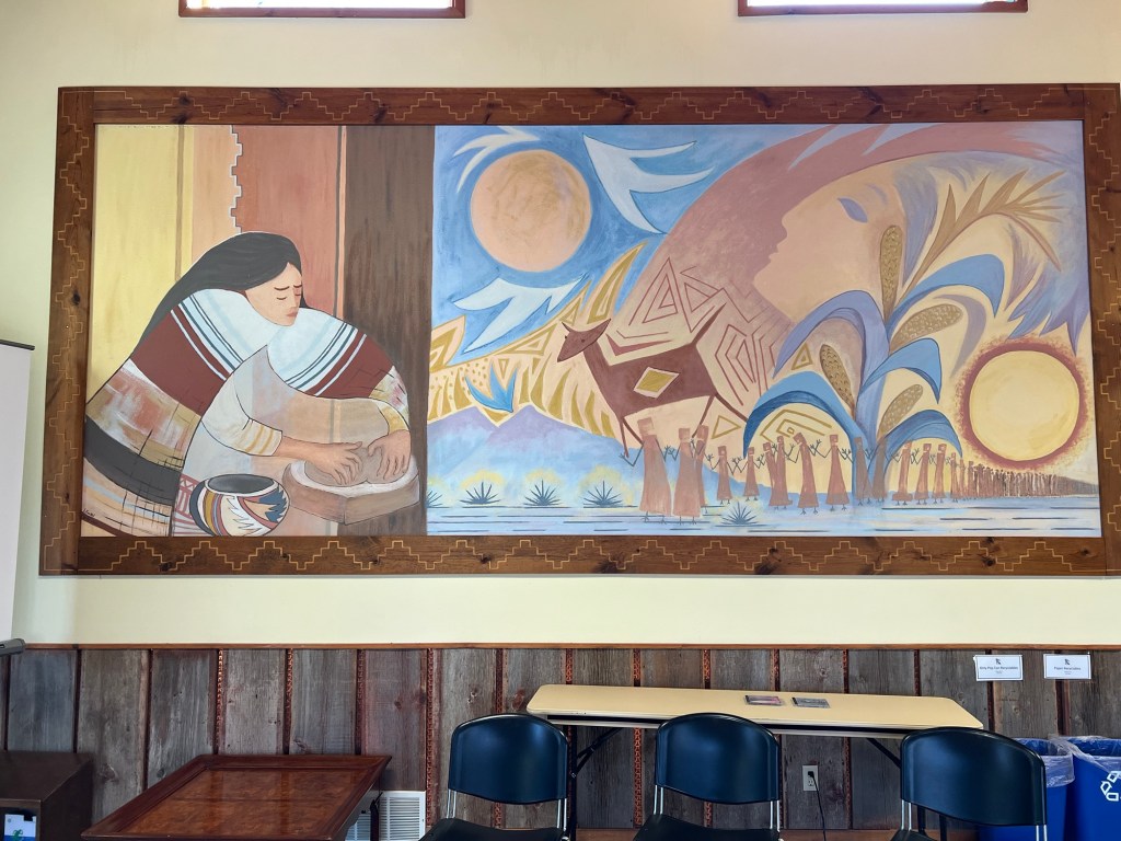 I also got asked to dig up some history and have been struck by the holiness of the place and the respect for the spirit of nature that has been there through so many eras. As I wrapped up my research last Thursday, I learned the name of the artists who created a mural behind me in Manresa, the central building where I had been working. It honors the way of life of the people who lived here before we did. That was the big lesson I’d learned, and it was literally all around me – on the wall behind me and in the woods outside the windows in front of me.