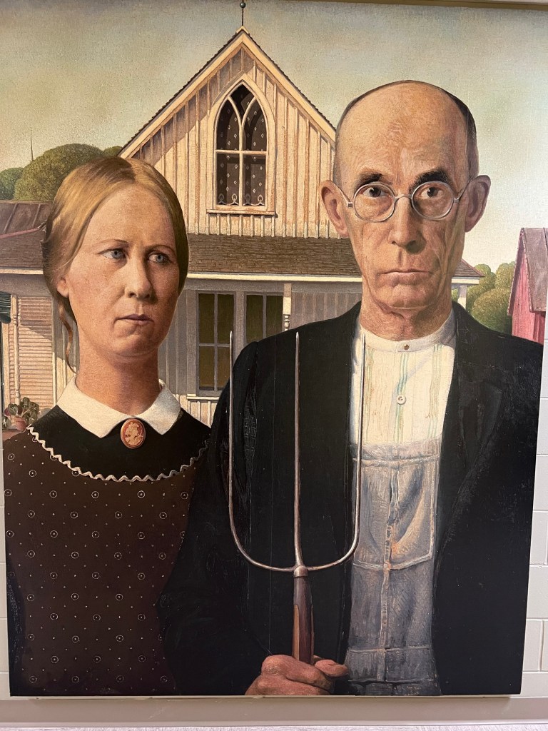 Finally in Wapello County on Friday, at Indian Hills Community College, this reproduction of American Gothic reminded me that nearby in Eldon, Iowa is where the house still stands.